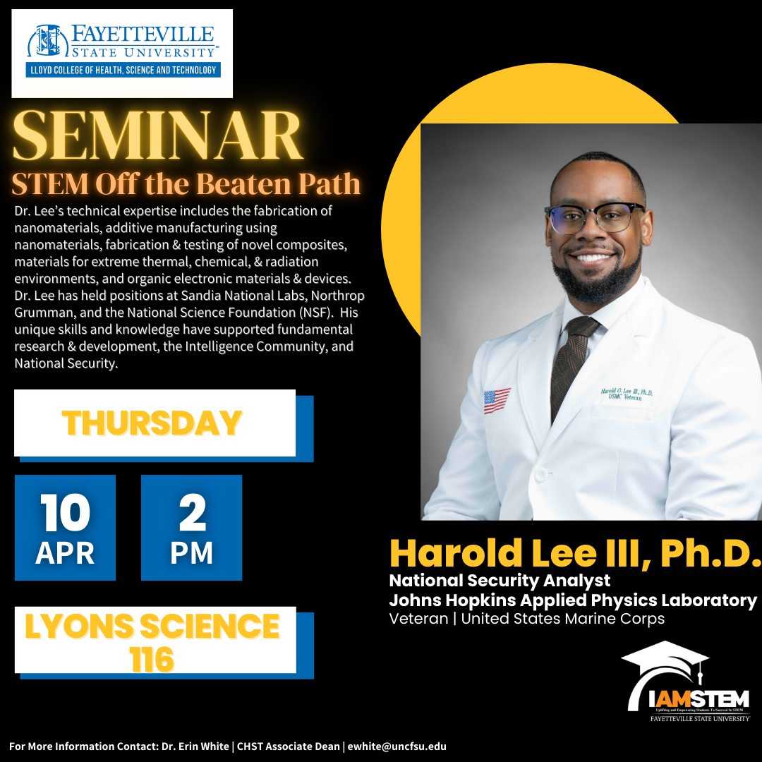 - Invited Speaker, “STEM Off the Beaten Path”, CHST STEM Seminar, Fayetteville State University, April 10, 2025, Fayetteville, NC